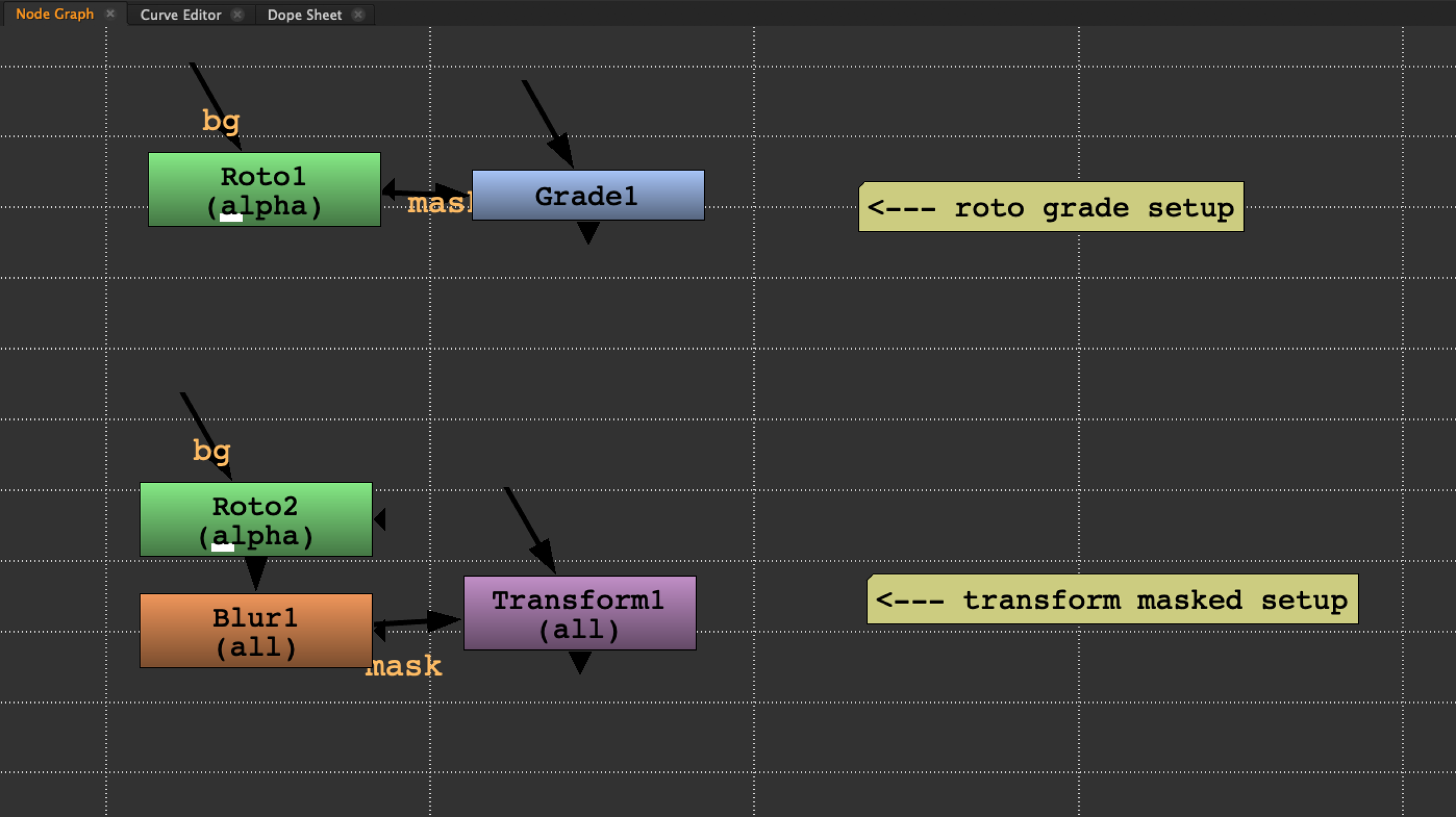 Roto and Grade Setup: Grade node with the mask input connected to a Roto node. Also assigns a hotkey to create the nodes quickly.