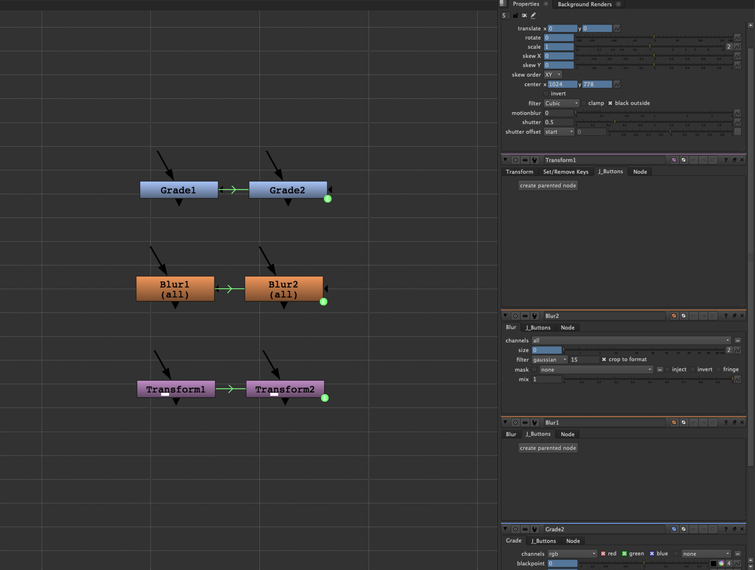 This script adds a tab to the Grade, Blur, and Transform nodes containing a button that creates parented nodes.
